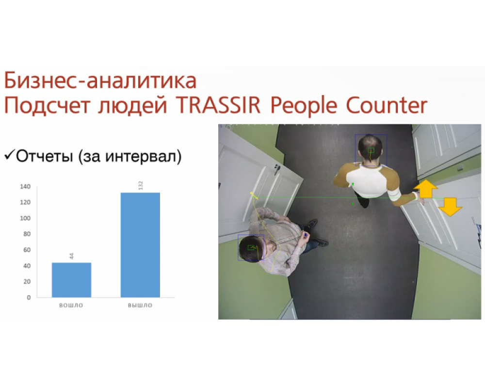 Кроме того, модуль TRASSIR People Counter включает функцию расчета конверсии торговой точки - отношения числа посетителей к количеству пробитых чеков. Для использования этой функции необходимо установить модуль ActivePOS (в комплект не входит). Стоимость обработки 1-го канала видео.